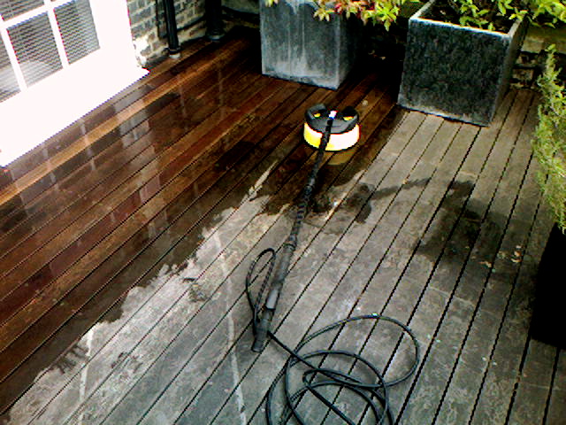 Decking cleaning by our Gardner in Kings cross Camden NW1 central london, above image before and after on the right with the work in progress image right and below.